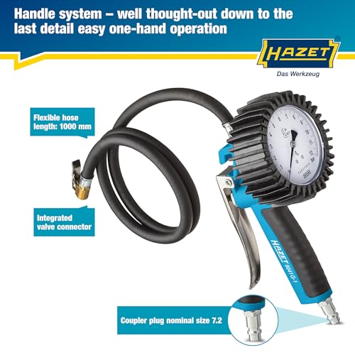 Manometro per pneumatici HAZET 9041G-1, Calibrato, di facile lettura, campo di misurazione del manometro: 0-10 bar, lunghezza del tubo flessibile: 1000 mm, diametro del manometro: 80 mm