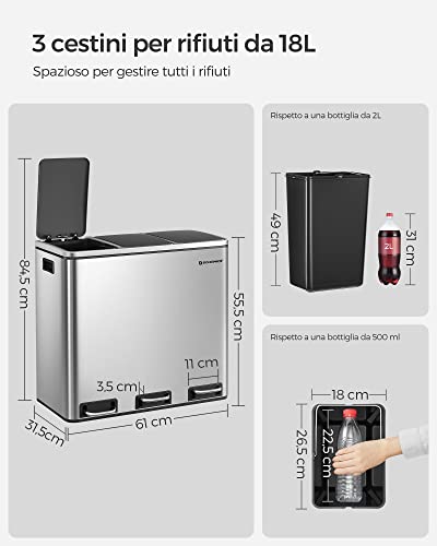 SONGMICS Cestino per Rifiuti a 3 Scomparti, Argento + Nero