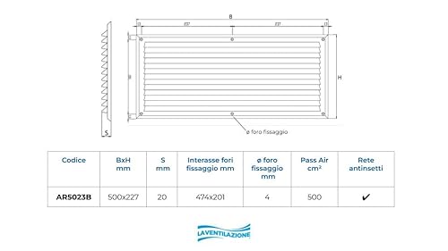 LA VENTILAZIONE Griglia Aerazione Con Rete Mm 500x227