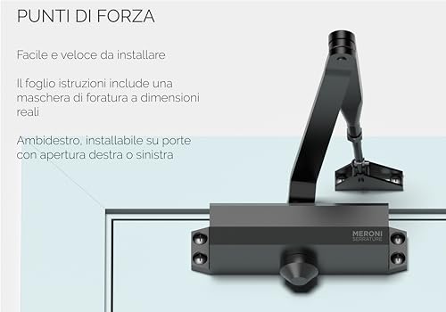 MERONI SERRATURE Chiudi Porta Aereo a Forza Variabile con Braccio Standard - Chiudiporta Meroni Modello Ambidestro, Ideale per Porte in Legno, Alluminio e Metallo, Certificato CE
