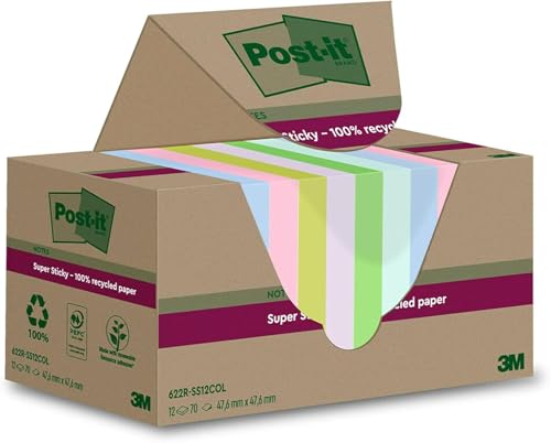 Post-it Foglietti Super Sticky Riciclati, Confezione da 12 Blocchetti, 70 Fogli per Blocchetto, 47.6 mm x 47.6 mm, Rosa, Verde, Blu, Viola, Giallo - Foglietti Super Adesivi in carta riciclata al 100%