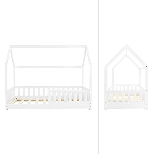 ML-DESIGN Letto A Casetta Per Bambini 80 X 160 Cm Bianco, In Legno Massello, Struttura Con Protezione Anticaduta, Tetto E Rete A Doghe, Lettino A Terra Montessori A Forma Di Casa Per Cameretta