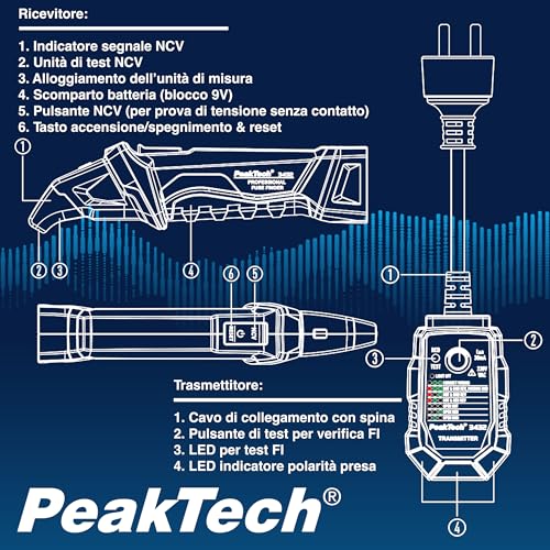 PeakTech 3432 - Rilevatore di sicurezza, dispositivo di localizzazione per circuiti elettrici, tester di tensione senza contatto con tester per presa Schuko da 230 V, tester di fase NCV