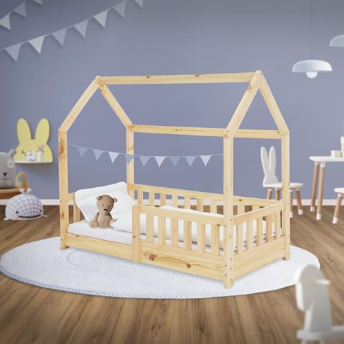 ML-Design Letto a Casetta per Bambini 70 x 140 cm Naturale, in Legno Massello, Struttura con Protezione Anticaduta, Tetto e Rete a Doghe, Lettino a Terra Montessori a Forma di Casa per Cameretta