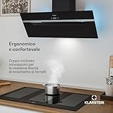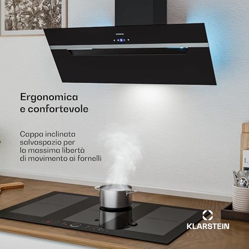 Klarstein BigBite Cappe Inclinate 90cm - Cappa Angolare, 417 m³/h Boost, Touch, LED, A+++, 3 Velocità , Filtro Carbone, Scarico & Ricircolo, Design Vetro, Cappa Cucina Moderna, Nero