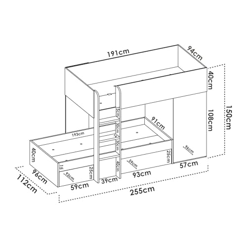 Dmora - Letto per bambini Marmolada, Cameretta completa con armadio e cassetti, Composizione letto a castello con due lettini singoli, 255x112h150 cm, Bianco e Rovere