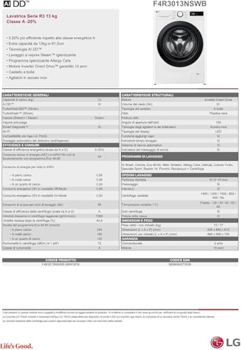 LG AI DD F4R3013NSWB LAVATRICE, Caricamento frontale, 13 kg, 12 programmi, Profondità 61,5 cm, Giri 1400 rpm, Bianca, livello rumorosità centrifuga 72 dB(A), Classe A