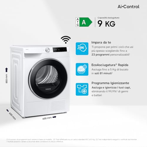 Samsung Asciugatrice AI Control DV90DG6845LE/U3, 9 kg, Pompa di Calore, Wifi, AI Dry+, Air Wash, Tecnologia Optimal Dry, Carica Frontale, 60L x 85H x 60P cm