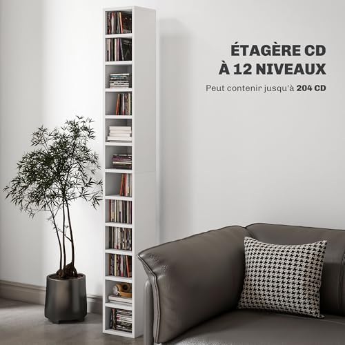 HOMCOM Contenitori per CD e DVD, ripiano a colonna, contenitore con 12 scomparti, capacità massima 204 CD, 21 x 20 x 175 cm, bianco
