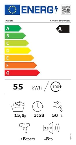 HAIER HW150-BP14986EIT LAVATRICE, Caricamento frontale, 15 kg, 14 programmi, Profondità 63 cm, Giri 1400 rpm, Bianco, livello rumorosità centrifuga 75 dB(A), Classe A