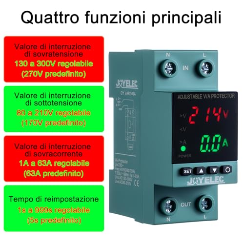 2 pièces Protettore di sovratensione e sottotensione,Stabilizzatore di Tensione,Dispositivo AC230V protezione da sovratensione Relè di ripristino regolabile Voltmetro 63A Protezione sovracorrente