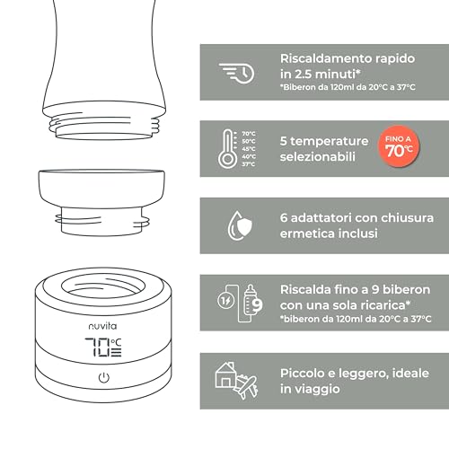 Nuvita 1166 Warm70 Scaldabiberon Portatile Senza Fili 70°C – Ricaricabile USB, Compatibile Universale, 5 Livelli di Temperatura Fino a 70°C, Riscaldamento Rapido 2,5 Min, Mantiene Caldo 6 Ore