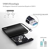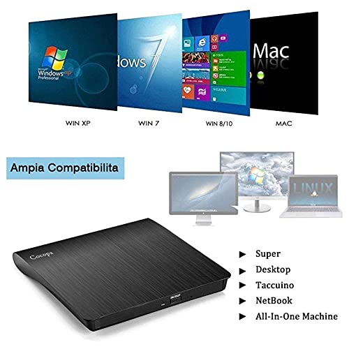 Cocopa Masterizzatore DVD Esterno, Lettore CD Esterno per PC Portatile Unità Esterna USB 3.0 DVD-R CD-RW Drive Dispositivo Ultra Slim Per Laptop Windows 98/ME/ 2000/XP/Vista/7/8/10/11 Mac Linux, Nero