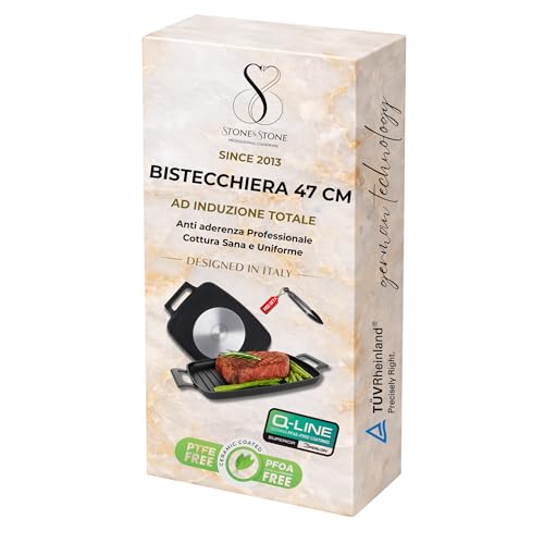 Stone&Stone Bistecchiera Induzione 47 cm Rettangolare, Piastra Grill Induzione BBQ Antiaderente con Rivestimento Ceramico Tedesco, Fondo Acciaio Pieno, con Pinza, Gas e Forno, Senza PFAS PFOA PTFE