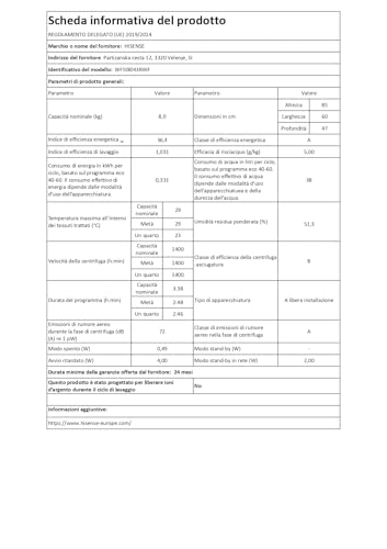 Hisense WF5i8043BWF LAVATRICE, Caricamento frontale, 8 kg, Profondità 47 cm, Giri 1400 rpm, Bianco, livello rumorosità centrifuga 72 dB(A), Classe A
