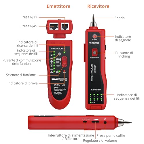 Proster Tester Cavo RJ45 RJ11 con Cuffie Tracciatore Tester Cavi Rete LAN Cavo RJ Portatile Localizzatore Cavo Cellulare Telefono Alta Sensibilità per LAN Ethernet BNC RJ45 RJ11-Rosso