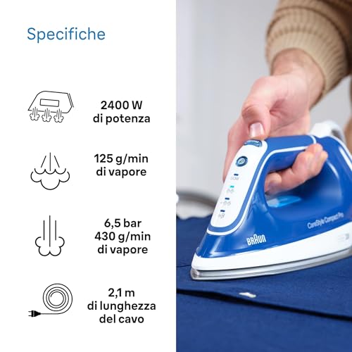 Braun CareStyle Compact Pro IS2565, Ferro Stiro a Vapore, Tecnologia FreeGlide 3D, iCareMode, Modalità Eco e Turbo, Stiratura Verticale, Antigocciolamento, Serbatoio 1.5L, 6.5 bar/430g/min, 2400W, Blu