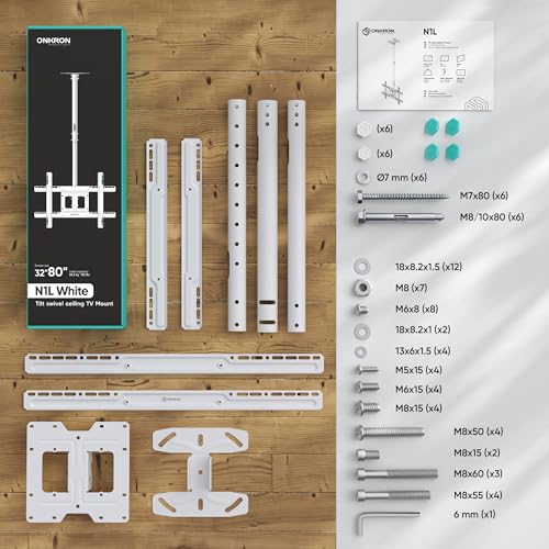 ONKRON Supporto TV da Soffitto 32-80 pollici, Portata 68,2 kg, Staffa TV VESA 100x100-600x400 mm, Inclinabile e Girevole, Porta Televisore Universale, Telescopico, con Gestione Cavi, Bianco, N1L-W