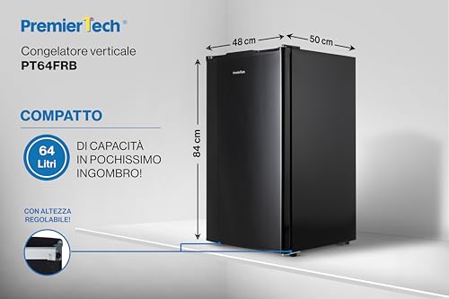 PREMIERTECH PT64FRB Mini Mini Freezer Congelatore verticale, 64 l, dimensioni: L 48 cm, A 84 cm, P 50 cm, Rumorosità 40 dB(A), 3 cassetti, Black, Classe E