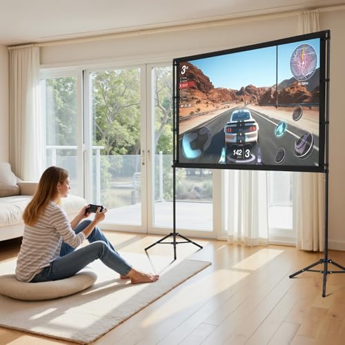 VEVOR Schermo per Proiettore con Supporto, Schermo di Proiezione Grandangolare da ca. 2133,6 mm Portatile per Interni ed Esterni, 160°, 4K HD 16:9, Doppio Treppiede con Borsa per il Trasporto