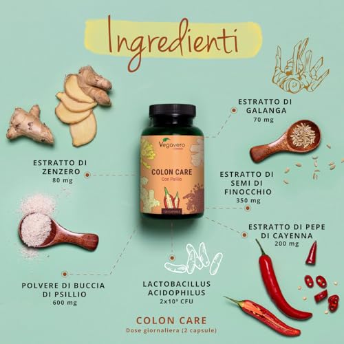 COLON CARE | 120 capsule | 100% Naturale con Psillio, Zenzero, Finocchio e Fermenti Lattici | Prodotto in Germania | Vegan e Senza Additivi | Vegavero