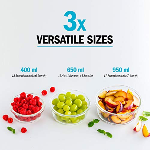 Igluu Meal Prep Contenitori Ermetici per Alimenti in Vetro Tondi con Coperchi (Set da 3) – Senza BPA – Forno, Microonde, Freezer e Lavastoviglie – 400 ml, 650 ml, 950 ml – Vetro Borosilicato